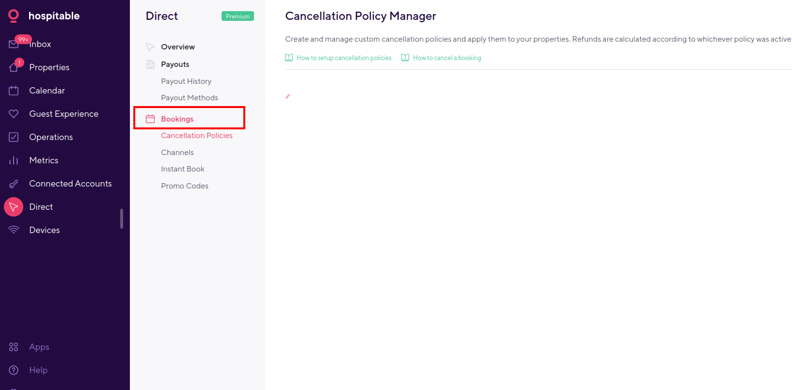 It defaults to the Cancellation Policy Manager when you click on “Bookings“ button. You can only access the Booking Policy Manager by using the link from the Help page or by typing it directly.